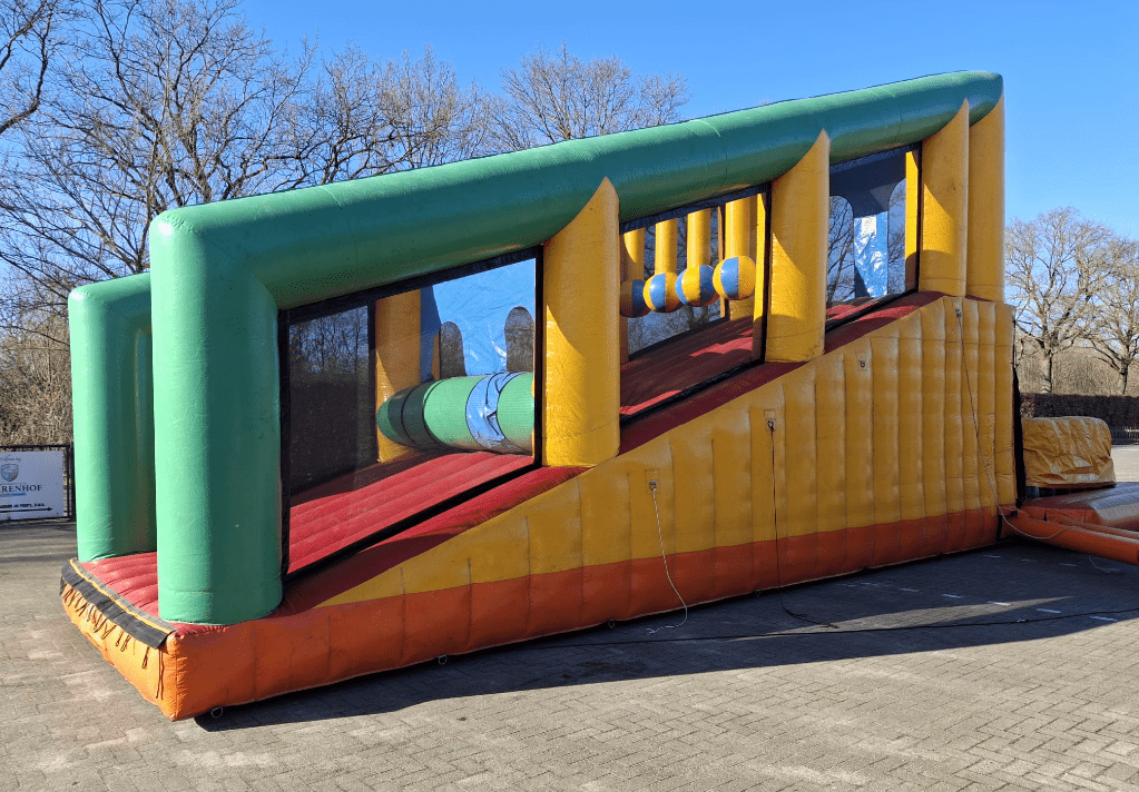 Ren omhoog over de schuine helling, klim behendig over de muur, wring je langs de obstakelballen en zet alles op alles voor de eindsprint… om vervolgens naar beneden te springen op het zachte valkussen! Actie gegarandeerd van begin tot eind.
